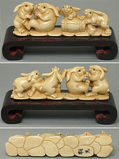 Rabbits with Snowpeas 100% Genuine Hippo Tusk Ivory 6.25 long x1.1 x 1 in #Hbun1 100% Handcrafted Hard Wood Stand For Display $125