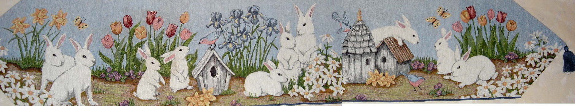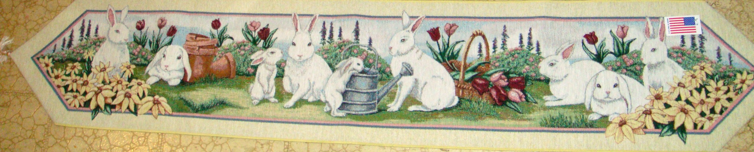 Bunnies in the Garden Wall Hanging - 26 x 24 inch with dowel rod and ribbon for hanging polyester, cotton, acrylic -dry clean only One Only! $40.00 |